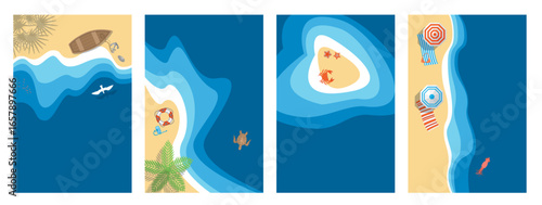 Top view of a set of colour minimalistic vector illustrations of sand coastline of blue sea, palm trees, boat, beach umbrellas, lifebuoy, seagulls, crab, turtle, starfish. Aerial. View from above