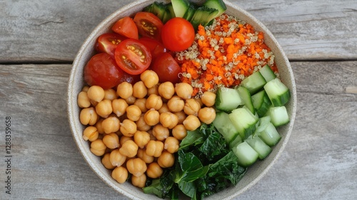 Top view of a vibrant Buddha bowl filled with quinoa, avocado, chickpeas, cherry tomatoes, cucumber, and leafy greens, arranged on a rustic wooden table with ample copy space around.