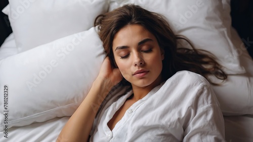 Top view of attractive beautiful young woman sleeping well in bed hugging soft white pillow, teenage girl resting, good night sleep concept. Lady enjoys fresh soft bedding linen and mattress in bedroo