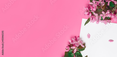 Top view of blank sheet of notebook and branches of apple blossoms on pink background. Copy space.