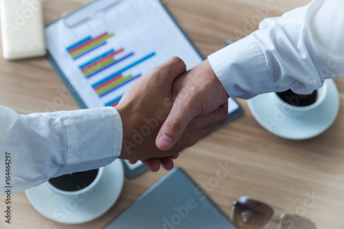Top view of businessman handshake on coffee table.Businesspeople shaking hands after a successful meeting.