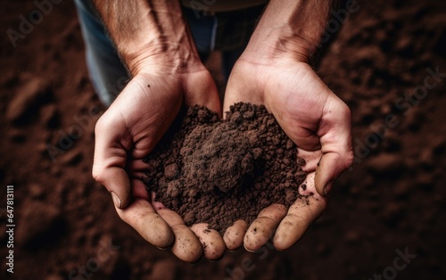 Top view of fertile soil in hands. Checking the quality of the soil before seed plant. Future agriculture concept. Generative AI