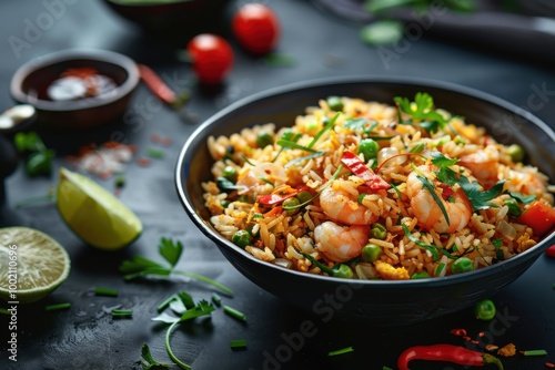 Top View of Fried Rice with Vegetables and Protein for a Savory, Flavorful Asian Dish