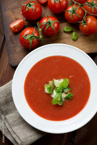 gazpacho, soup, tomatoes, red, vegetable, vegetarian, healthy, meal, delicious, epicure, cookery, ingredient, natural, organic, food, still life, foodstuff, nobody, indoor, studio shot, closeup, closeup, wood, wooden, white, plate, glasses, clothes, chopping board, chopping board, cucumber, topping, topview