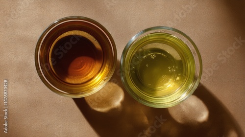 Top view of golden herbal and green tea in glass cups under warm directional sunlight