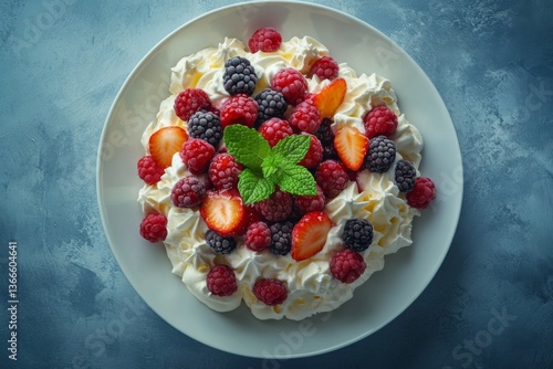 Top view of healthy dessert with berries nuts and yogurt in bowl