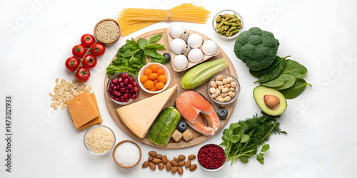 Top View of Healthy Food Chart with White Background - Fruits, Vegetables, Protein, Grains, and Dairy Products