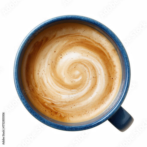 Top view of hot coffee with smooth crema and swirl pattern in blue cup isolated on transparent background.
