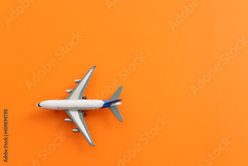 Top view of orange background and airplane. Concept of travel, vacation