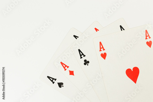 Top view of playing cards on white background. Four aces cards, board game, poker. Copy space, flat lay.