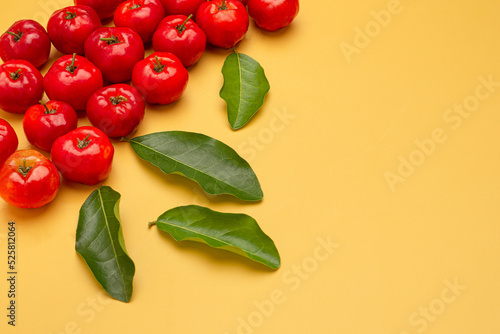 Top view of ripe red acerola cherries and green leaves on a yellow background