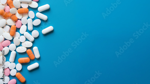 Top view of Scattered pills on blue background. Space for text, Generative AI