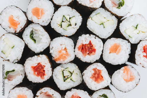 Top view of sushi maki rolls with salmon and cucumber and other ingredients