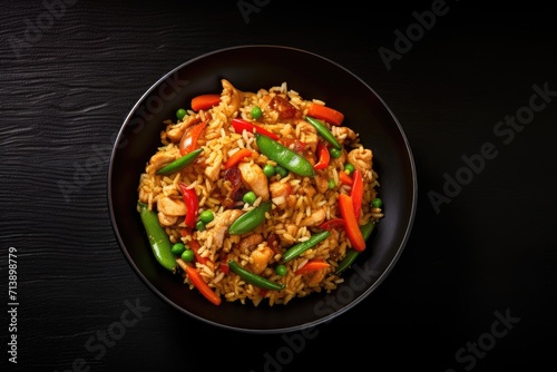 Top view of Szechuan Rice in a black bowl with bell peppers green beans carrots and chicken breasts on a dark slate background