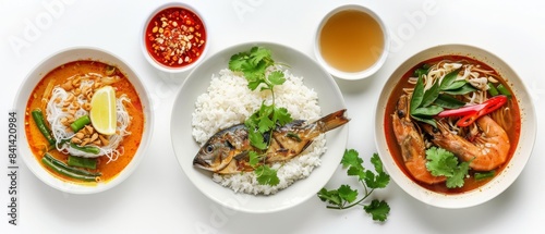 Top view of traditional Asian cuisine with rice, fish, shrimp, curry dishes and side condiments on a white background.