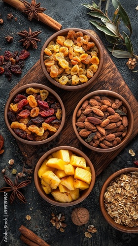 Top view of various nuts, dried fruits, and spices beautifully arranged in rustic bowls on a wooden surface.