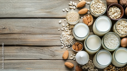 Top view of various plant-based milk bottles: almond, oat, soy, rice, corn, and coconut, with copy space on a wooden background.
