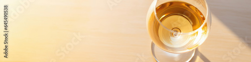 Top view of white wine in a glass on white wooden table, blurred background. Wine shop or wine tasting concept. Soft light. Copy space banner. The concept of wine tasting, tourism, wine festival.