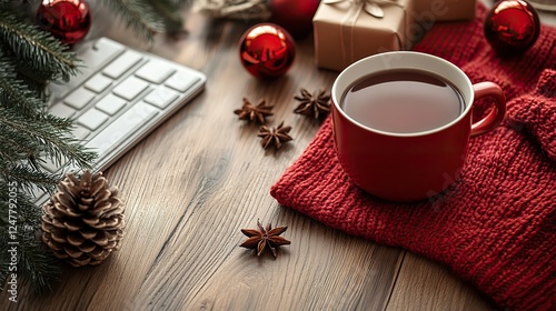 Top view photo of keyboard, cup of hot drink, red Christmas tree balls, pine twigs, cone, anise, sweater and giftbox on white background with empty space.
