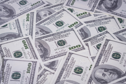 Top view pile of one hundred dollars as background. Texture US dollars.