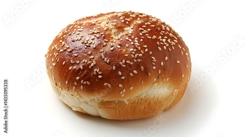 Top view shot of a hamburger bread bun, isolated on white background. The freshly baked, golden brown color and a sprinkling of sesame seeds on top.