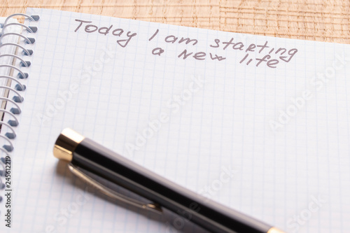 Top view workplace notebook and pen on wood table background. Inscription - Today I am starting a new life.