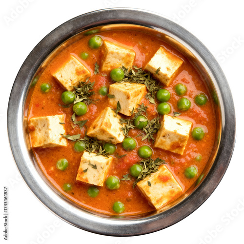 Top-Down Flat Lay of Traditional Indian Mutter Paneer Curry in a Steel Bowl