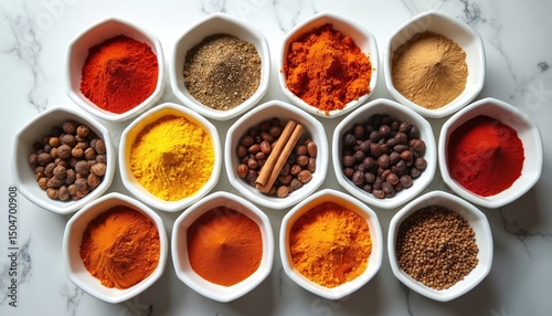 Top-down shot of diverse spices in white bowls. Culinary arts, home cooking, kitchen aesthetics, food presentation. Flavor enhancements, cooking, gastronomy, herbs, ingredients, seasoning for healthy