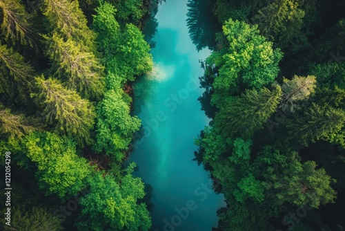 Top-down view of a dense tropical forest with a river cutting through, showcasing vibrant greenery and natural beauty,