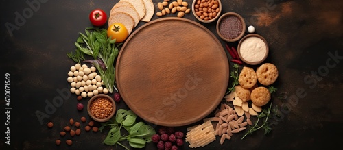 Top-down view of a round cutting board and frame with various allergenic food products, providing a space for writing or copying.