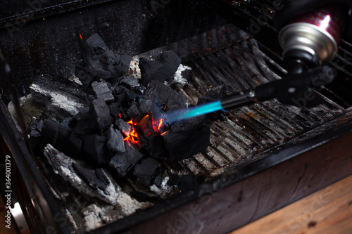 Torch with fire burning charcoal from a grill - lighting charcoal for the grill