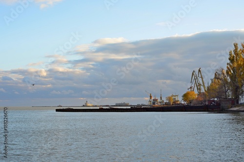 Торговый порт, Shipping.cargo to harbor.Aerial view.Top view.. Cargo cranes in the dock by the water over blue sky