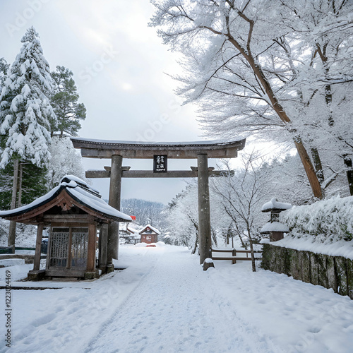Torii Gate Leading to a Shrine in a Snowy Landscape Japan
