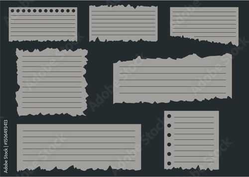 Torn Lined Paper Notes Collection – Vintage Scrapbook Style Vector, A set of torn notebook paper pieces with lines and perforated edges.