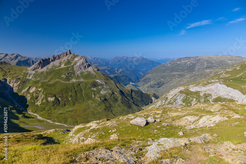 Tour du Mont Blanc beautiful landscapes in the Alps mountains on a sunny summer day. Green grass on the alpine meadow surronded by high mountain peaks of Montbalnc alpine range