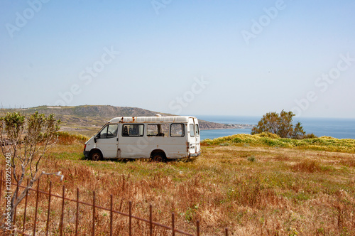 travel, traveling, adventure, landscape, vacation, summer, trip, wanderlust, sea, view, seascape, island, car, vehicle, travelling, truck, van, nature, road, transport, transportation, journey, freedom, beach, tour tourism, scenery, motor, lifestyle, mobile home, no people, caravanning, place, adventurer, parked, greek, mountain, copy space, trailer, santorini, route, travel destination, family, active
