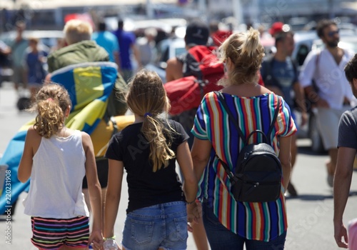 people, backpack, group, street, young, happy, walk, woman, travel, family, friends, stroll, city, departure, arrive, fun, children, casual, student, portrait, college, school, white, shop, urban
