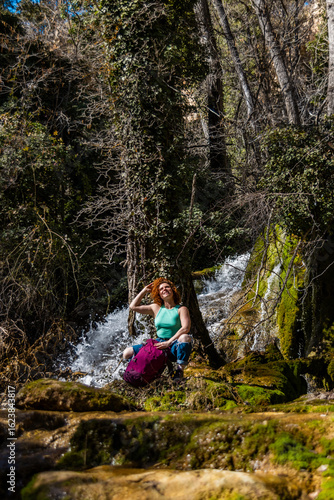 waterfall, forest, wood, nature, hiking, trekking, trip, travel, holiday maker, woman, hiker, backpack, adventure, outdoors, landscape, water, stream, river, tree, green, moss, rock, stone, sunlight, scenic, beautiful, peaceful, serene, relaxing, enjoying, exploring, healthy, lifestyle, active, recreation, leisure, freedom, wanderlust, discovery, destination, journey, excursion, ecotourism, sustainable, tour tourism, vertical