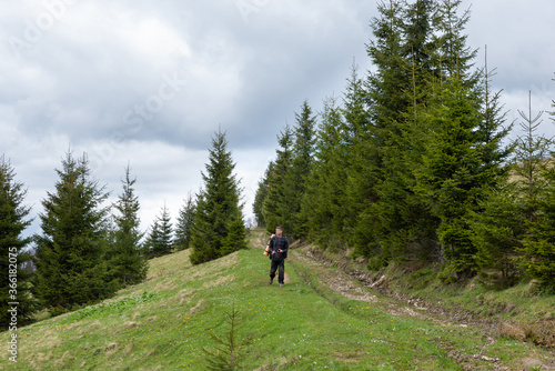 man, guy, goes, walk, look, walk, clothes, activewear, suit, holiday maker, nature, grass, tree, spruce, pine, conifer, spring, flower, wildflower, road, path, sky, cloud, weather, season, glade, meadow, travel, forest, photographer, technology, fresh air, landscape, beautiful, rest, vacation