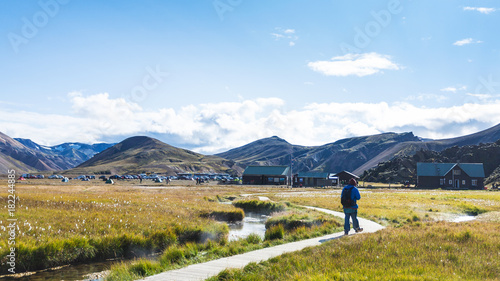 iceland, nature, natural, travel, landscape, icelandic, autumn, season, september, tour tourism, tour, trip, journey, visit, nordic, country, scenery, scenic, view, arctic, holiday maker, people, visitor, landmannalaugar, area, highland, mountain, trekking, route, hiking, trail, sunny, day, sightseeing, excursion, building, house, apartment, settlement, village, camp, camping, vale, meadow, stream, water, flow