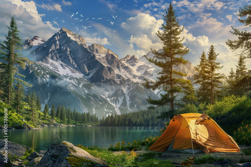 Tourist tent camping in mountains against backdrop of beautiful nature