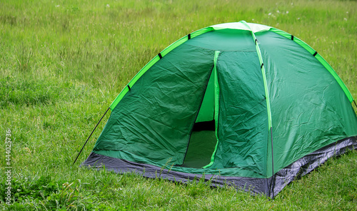tourist tent, outdoor recreation near the river. Nature, recreation, camping.