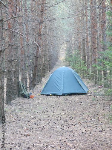 tourist tents in the autumn pine forest