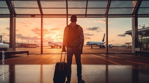 Tourist travel, Young man standing at departure hall to travel by international flight airplane alone at sunset, modern lifestyle , AI generated photo, copy space for text