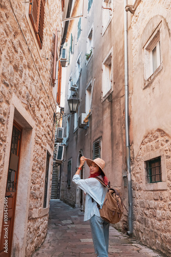 holiday maker, woman, walking, street, town, old, europa, travel, tour tourism, adventure, exploring, backpack, hat, architecture, narrow, alley, city landscape, destination, journey, discovery, vacation, holiday, sightseeing, urban, outdoors, summer, lifestyle, traveler, wanderlust, building, historical, traditional, culture, cobbled, picturesque, charming, scenic, beautiful, day, solo, female, montenegro, kotor