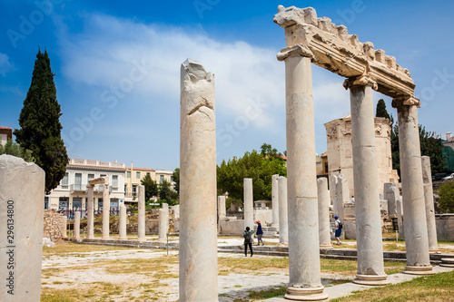 Tourists visiting the ancient ruins at the Roman Agora located to the north of the Acropolis in Athens