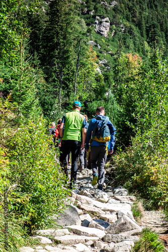 Tourists walk along a mountain trail in the Tatras in Slovakia