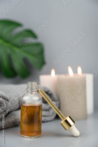 Towel with aromatic candles and bottle with natural organic oil essence serum. Aromatherapy and beauty. Concept set of harmony, balance and meditation, spa, massage, relax, beauty spa treatment.