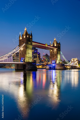 Tower Bridge and The City of London skyscrapers reflecting in River Thames at sunset, London