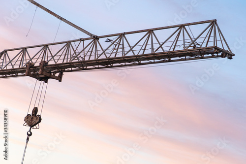 tower crane on the background of the sky at sunset. The boom of a construction crane closeup.